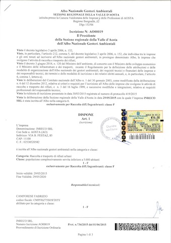 INRECO, è iscritta dal 20.04.2001 all’Albo Nazionale Gestori Ambientali – Sez. reg. Valle d’Aosta – al nr. AO0019 per le categorie 1 Classe F, 4 Classe F, 5 Classe F ed 8 Classe F, in possesso della Certificazione Ambientale UNI EN ISO 14001/2015 e abilitazione al Trasporto in ADR.
